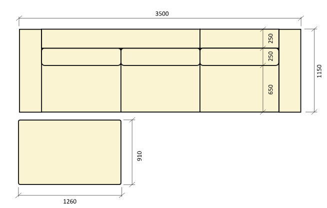 - Глубина: 1150 мм, 2060 мм с пуфом