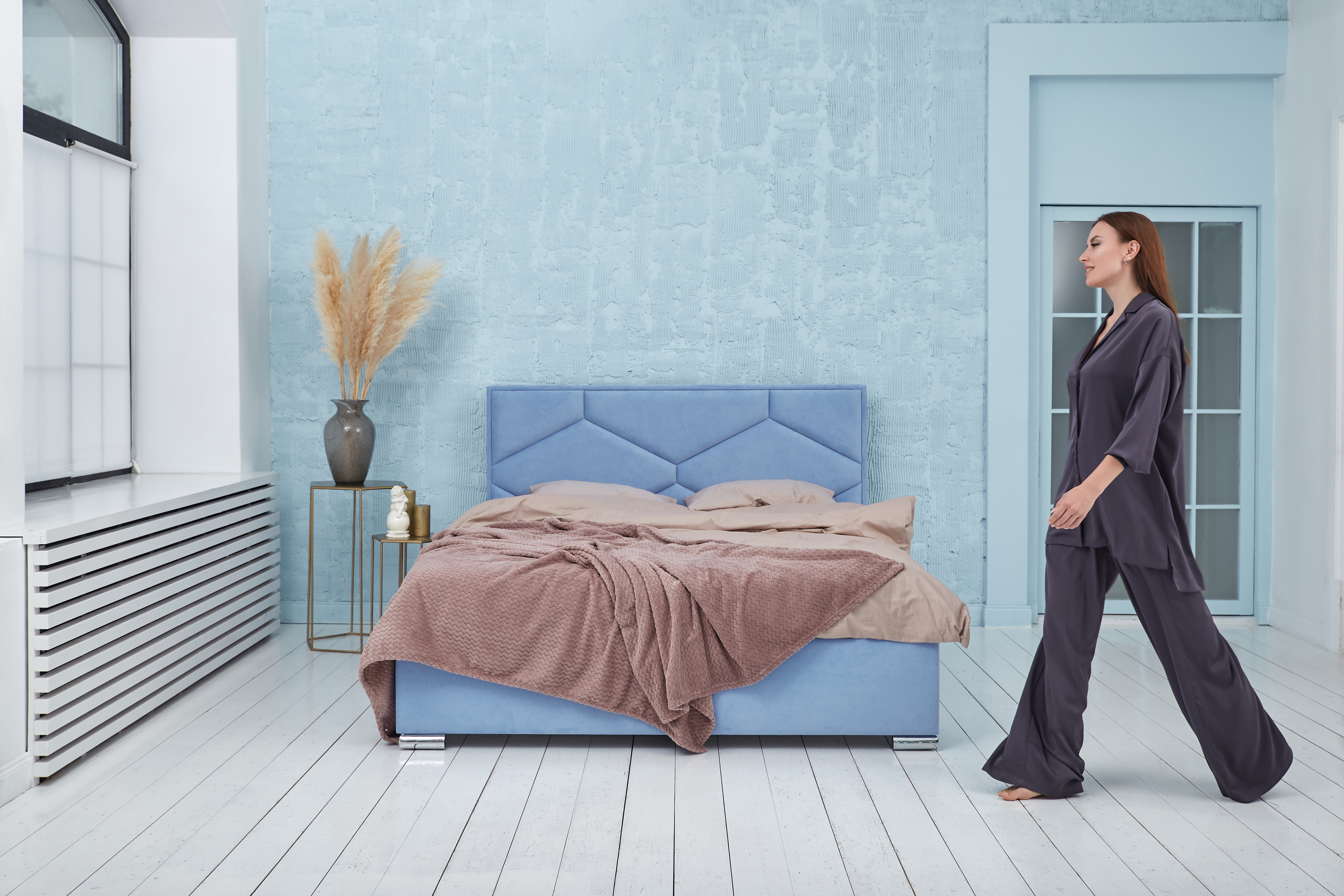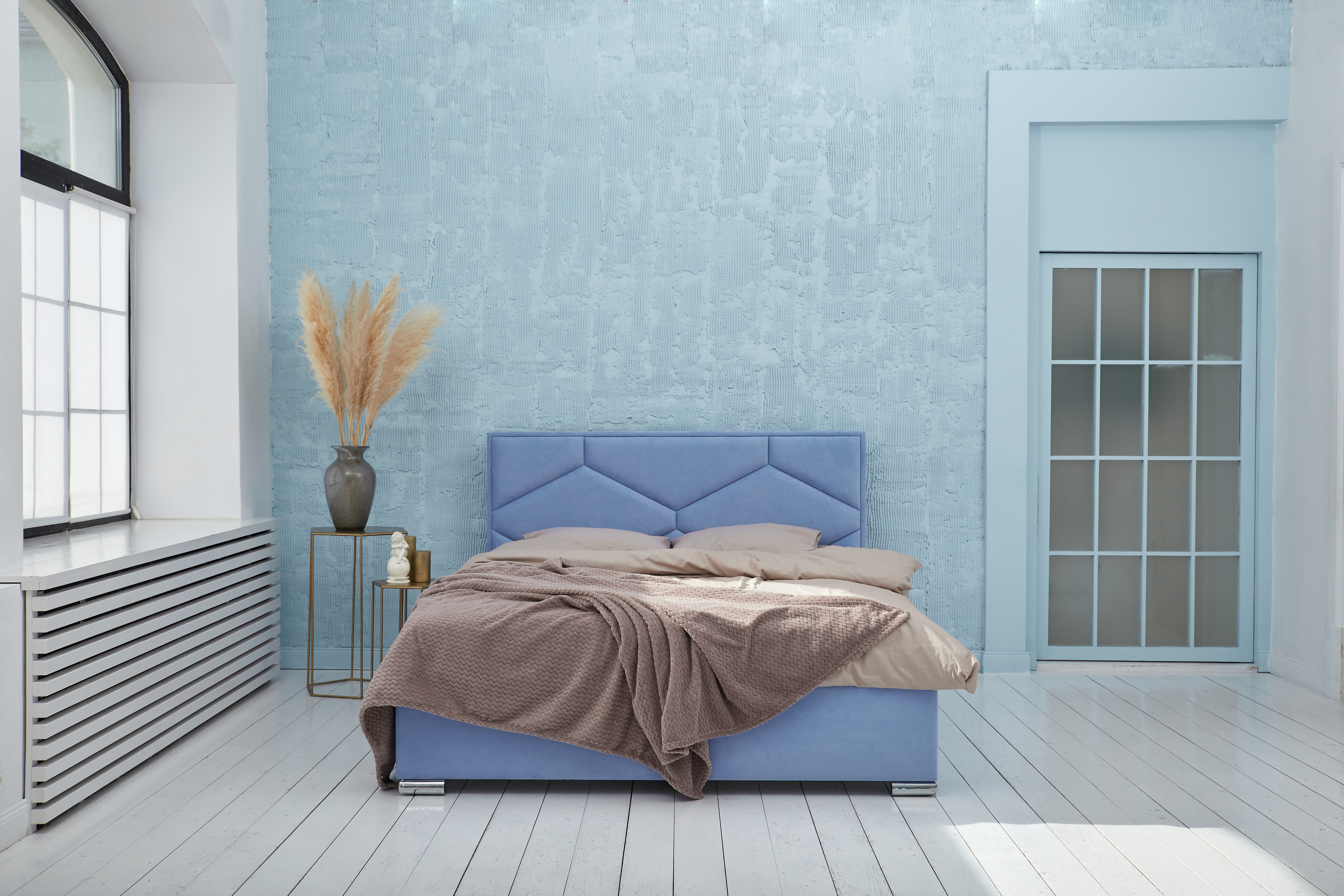 Современная и универсальная модель. Оригинальная стяжка изголовья кровати TORINO в виде крупных ромбов идеально впишется в любой интерьер. Ножка-опора «ЧАЙКА» позволит использовать для уборки под кроватью робот-пылесос.