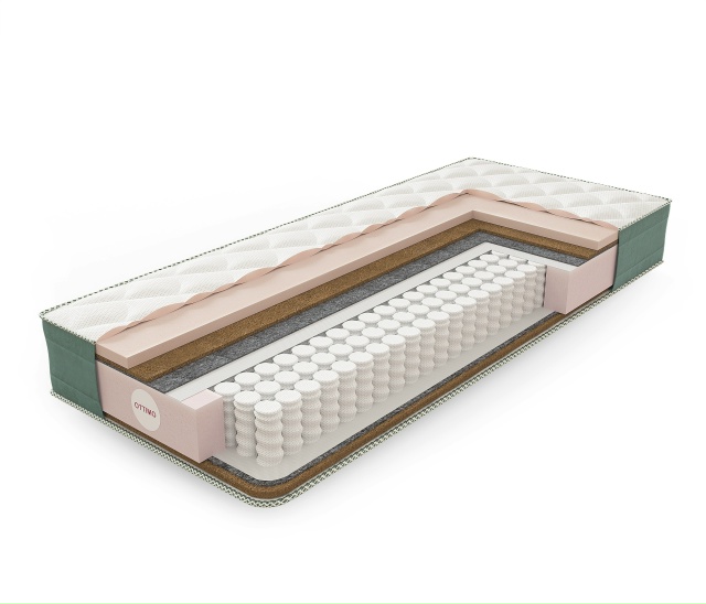 в составе: натуральный латекс, кокосовая койра для жесткости, на основе независимого пружинного блока с усиленным еврокоробом по периметру
