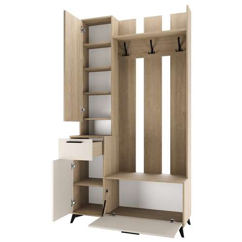 Модуль универсальный 1200 "ЕВА" с ящиком на направляющих скрытого монтажа с доводчиками. Фасады, лицевой периметр модуля обработаны кромкой 1 мм. Зеркало с обработкой "фацет" по периметру. Чёрные металлические ручки, крючки и ножки-опоры.