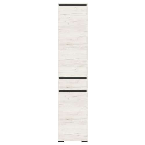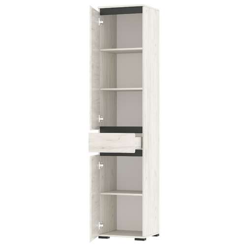 Пенал "ГРЕТТА" 2-створчатый с полками, с ящиком на направляющих полного выдвижения. Применение интегрированной ручки на фасадах делает модель стильной и безопасной – дверцы открываются за профилированные выступы. Фасады обработаны кромкой 1 мм.