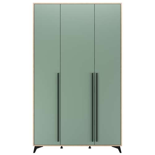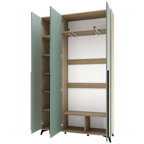 Шкаф 1300 3С "ЕВА" с выдвижными металлическими штангами, с полками. Фасады и лицевой периметр шкафа обработаны кромкой 1 мм. Чёрные металлические ручки-рейлинги и ножки-опоры.