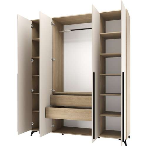 Шкаф 1800 4С2Я "ЕВА" с металлической штангой, полками и ящиками на направляющих скрытого монтажа с доводчиками. Фасады и лицевой периметр шкафа обработаны кромкой 1 мм. Чёрные металлические ручки-рейлинги и ножки-опоры.