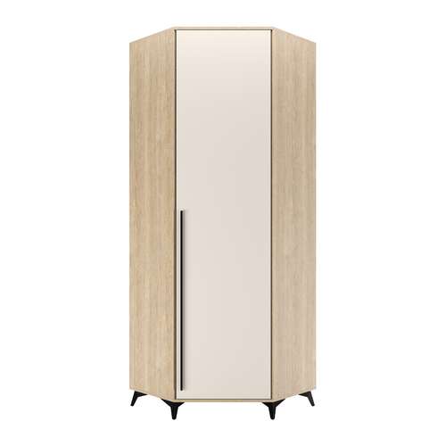 Шкаф угловой 800 1С "ЕВА" с поперечной металлической штангой, с полками. Фасад и лицевой периметр шкафа обработаны кромкой 1 мм. Чёрная металлическая ручка-рейлинг и ножки-опоры.