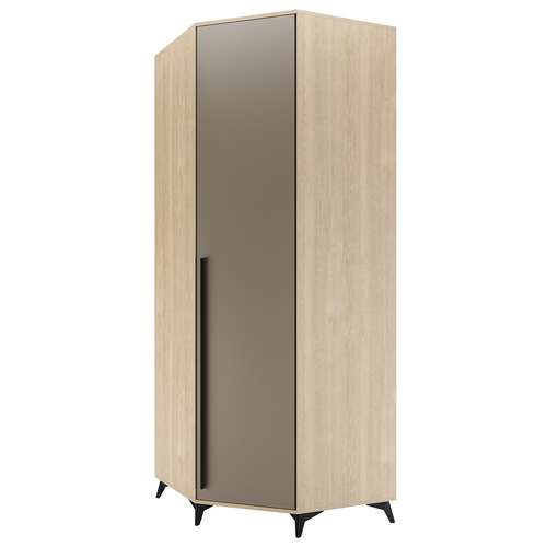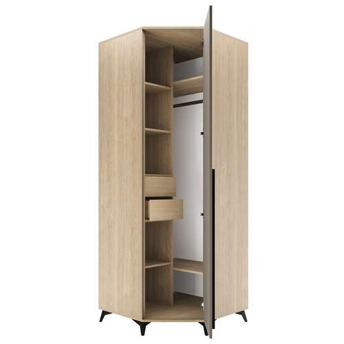 Шкаф угловой 840 1С2Я "ЕВА" с металлической штангой, полками и ящиками на направляющих скрытого монтажа с доводчиками. Фасады и лицевой периметр шкафа обработаны кромкой 1 мм. Чёрные металлические ручки-рейлинги и ножки-опоры.