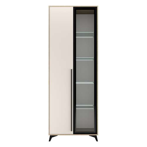 Шкаф-витрина 800 1В1С "ЕВА" с полками и стеклополками. Фасад ЛДСП и лицевой периметр шкафа обработаны кромкой 1 мм. Фасад с графитовым стеклом выполнен в профиле МДФ. Чёрные металлические ручки-рейлинги и ножки-опоры.