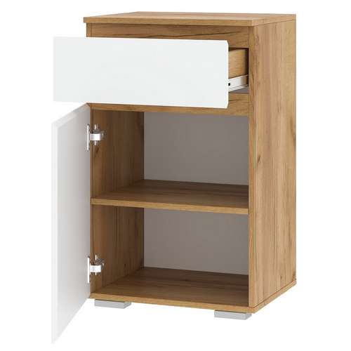 Тумба 1С1Я "ГРЕТТА" 1-створчатая с полкой, с ящиком на направляющих полного выдвижения. Применение интегрированной ручки на фасадах делает модель стильной и безопасной – дверцы открываются за профилированные выступы. Фасады обработаны кромкой 1 мм. Серебристая регулируемая ножка-опора.