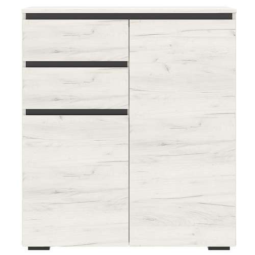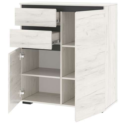 Тумба 2С2Я "ГРЕТТА" 2-створчатая с полками, с ящиками на направляющих полного выдвижения. Применение интегрированной ручки на фасадах делает модель стильной и безопасной – дверцы открываются за профилированные выступы. Фасады обработаны кромкой 1 мм. Черная регулируемая ножка-опора.