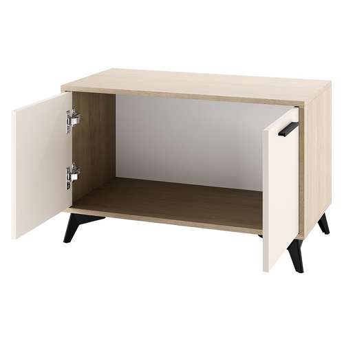 Тумба 800 2С "ЕВА" с распашными фасадами. Фасады, крышка и лицевой периметр тумбы обработаны кромкой 1 мм. Чёрные металлические ручки и ножки-опоры.