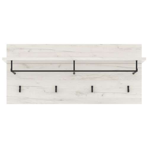 Вешалка 900 "ГРЕТТА" с полкой навесная. Чёрные матовые металлические крючки и опора полки. Крепится к стене через навесные элементы.